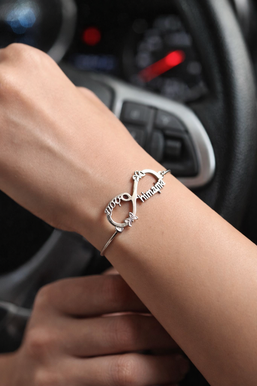 أنسيال بشكل إنفينيتي ♾️ بتصميم أنيق وخاص، محفور عليه الأسماء اللي بتجمعكم، عشان يفضل رمز للحب اللي ما بينتهيش 💖.