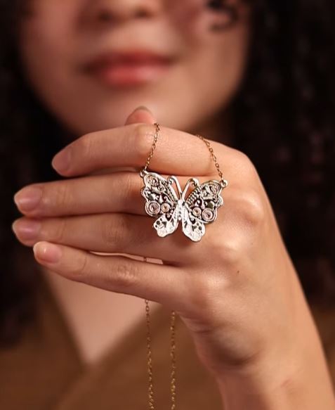 قطعة أنيقة مصنوعة بدقة عالية، مجسّمة ومزيّنة بخطوط ناعمة تعكس حركة جناحات الفراشة وروحها الحرة.